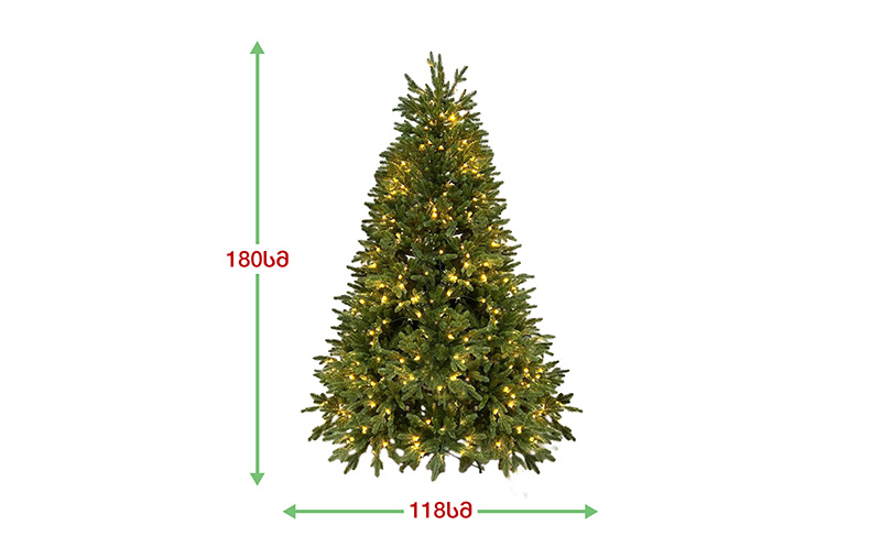 ბუნებრივის მსგავსი მწვანე ნაძვის ხე, ინტეგრირებული LED ნათურებით, დამზადებული 100% სილიკონის წიწვებით. გამძლე დრეკადი მეტალის ტოტებით და ჯანმრთელობისთვის უსაფრთხო მასალისგან დამზადებული წიწვებით. მეტალის მყარი სადგამით და მთავარი ღერძით.