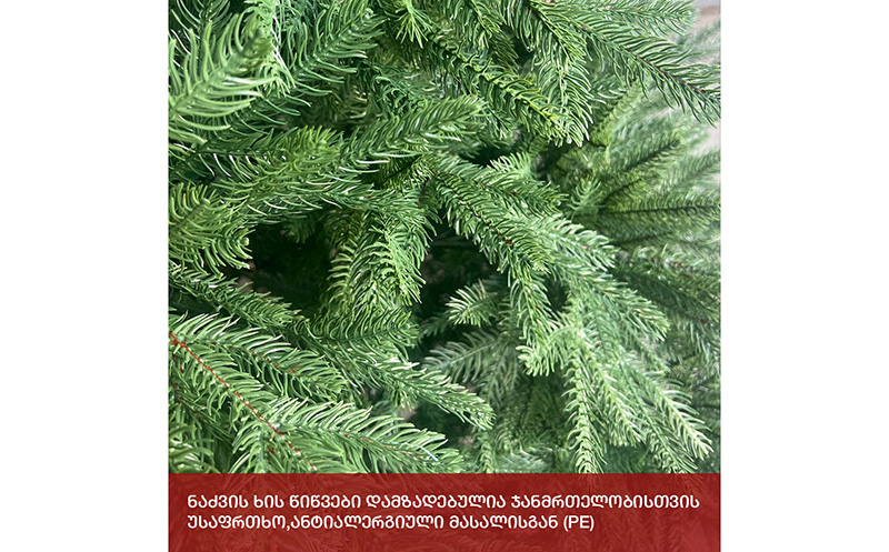 ბუნებრივის მსგავსი მწვანე ნაძვის ხე, დამზადებული 100% სილიკონის წიწვებით. გამძლე დრეკადი მეტალის ტოტებით და ჯანმრთელობისთვის უსაფრთხო მასალისგან დამზადებული წიწვებით. მეტალის მყარი სადგამით და მთავარი ღერძით.