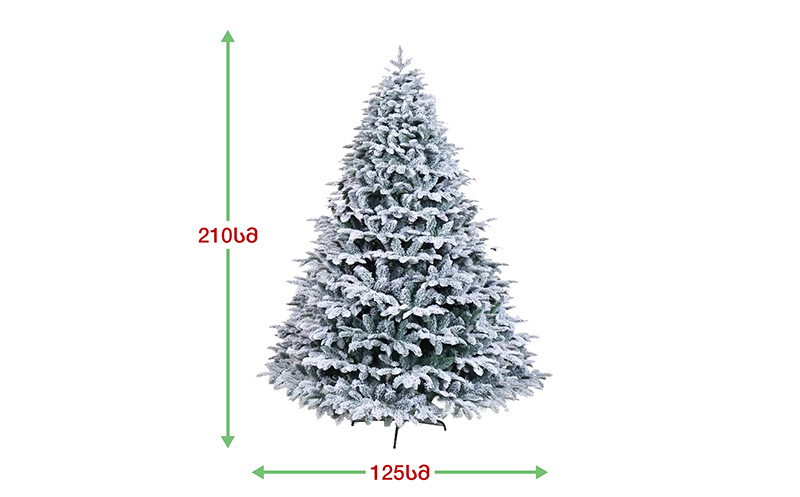 ბუნებრივის მსგავსი დათოვლილი ნაძვის ხე, დრეკადი მეტალის ტოტებით და ჯანმრთელობისთვის უსაფრთხო მასალისგან დამზადებული სილიკონის და PVC წიწვით . მეტალის მყარი სადგამით და მთავარი ღერძით.