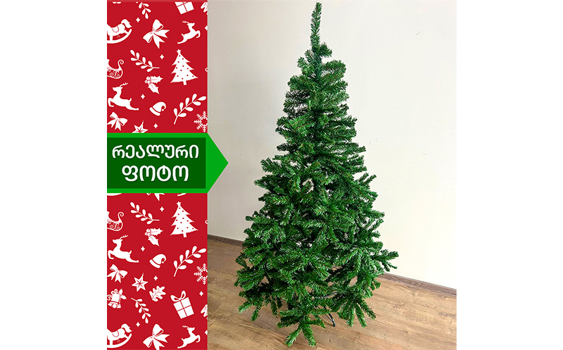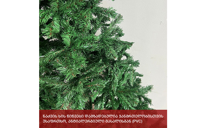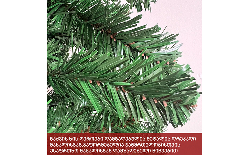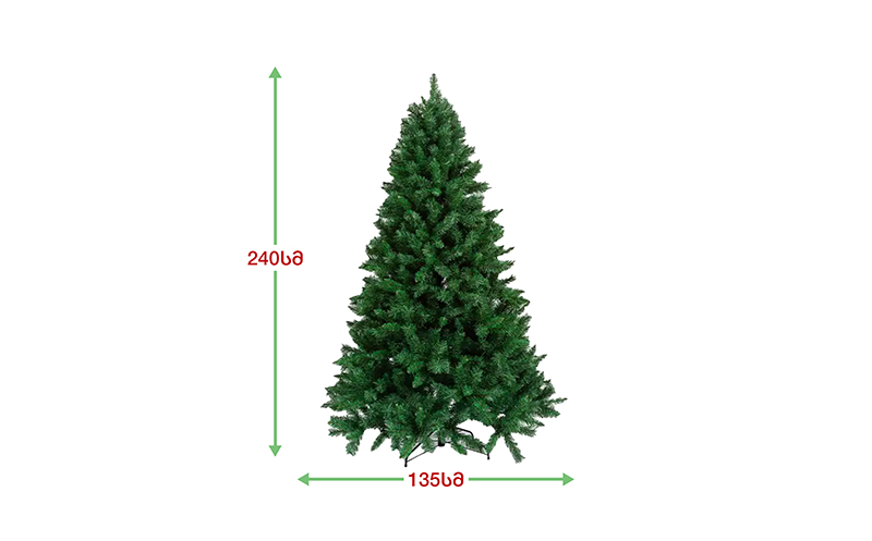 სადა მწვანე ნაძვის ხე გამძლე დრეკადი მეტალის ტოტებით და ჯანმრთელობისთვის უსაფრთხო მასალისგან დამზადებული წიწვებით. მეტალის მყარი სადგამით და მთავარი ღერძით.