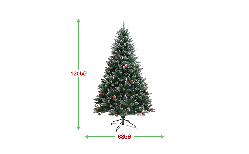 ნაძვის ხე დათოვლილი ბოლოებით, გაფორმებული გირჩებით და კენკრით. გამძლე დრეკადი მეტალის ტოტებით და ჯანმრთელობისთვის უსაფრთხო მასალისგან დამზადებული წიწვებით. მეტალის მყარი სადგამით და მთავარი ღერძით.