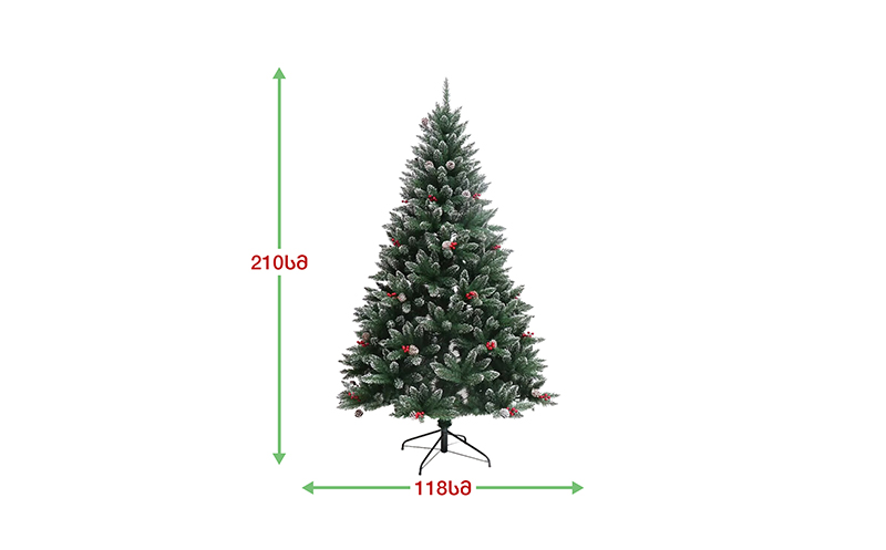 ნაძვის ხე დათოვლილი ბოლოებით, გაფორმებული გირჩებით და კენკრით. გამძლე დრეკადი მეტალის ტოტებით და ჯანმრთელობისთვის უსაფრთხო მასალისგან დამზადებული წიწვებით. მეტალის მყარი სადგამით და მთავარი ღერძით.