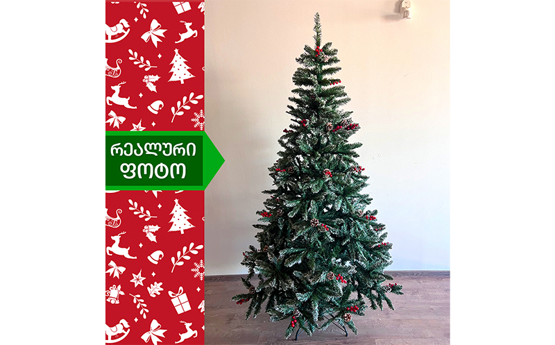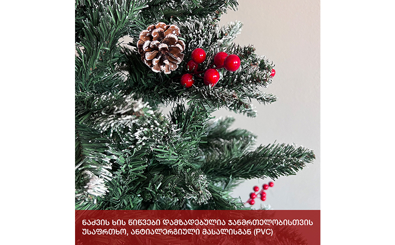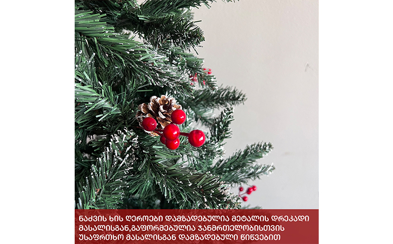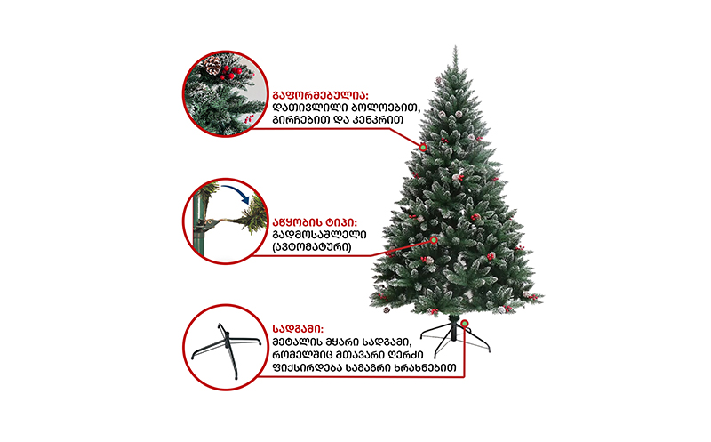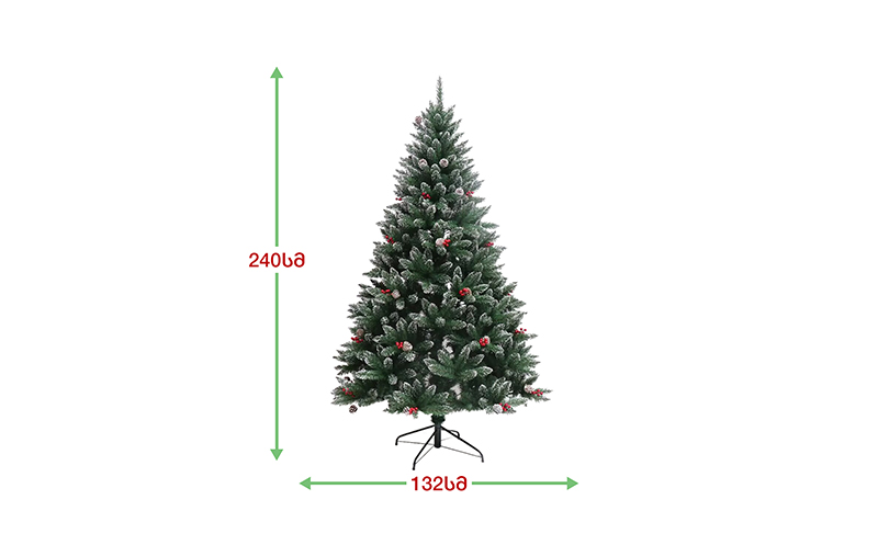 ნაძვის ხე დათოვლილი ბოლოებით, გაფორმებული გირჩებით და კენკრით. გამძლე დრეკადი მეტალის ტოტებით და ჯანმრთელობისთვის უსაფრთხო მასალისგან დამზადებული წიწვებით. მეტალის მყარი სადგამით და მთავარი ღერძით.