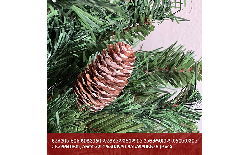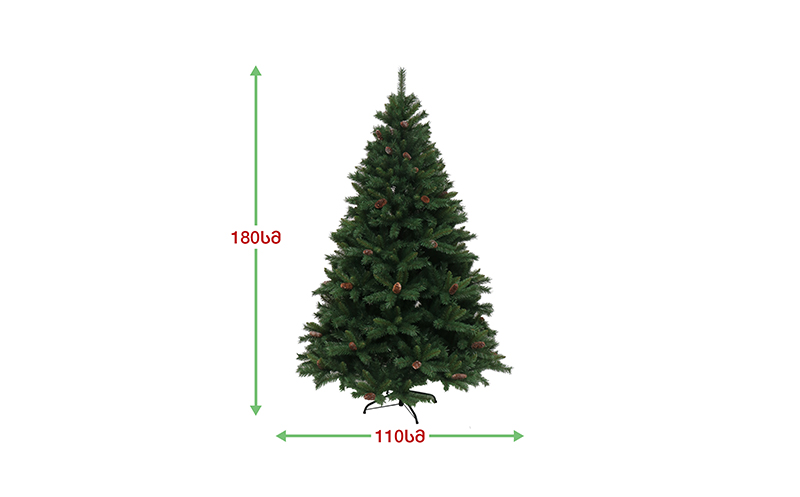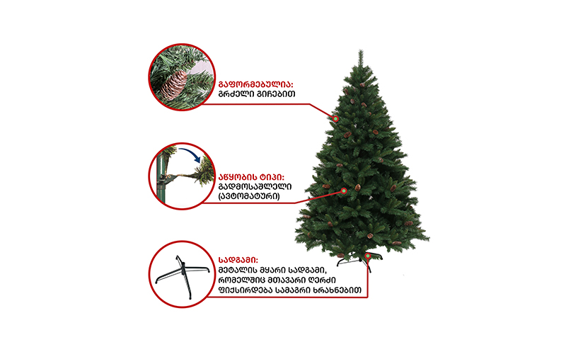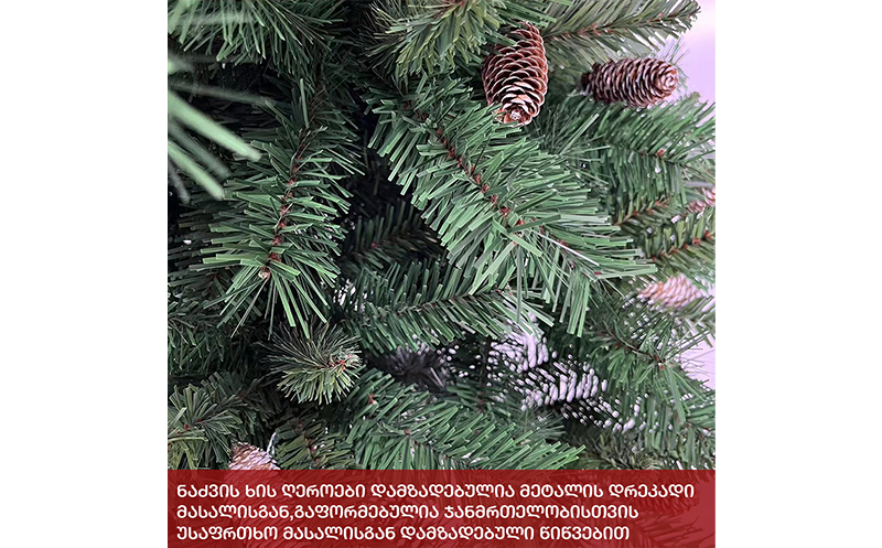 სადა მწვანე ნაძვის ხე, გაფორმებული გირჩებით გამძლე დრეკადი მეტალის ტოტებით და ჯანმრთელობისთვის უსაფრთხო მასალისგან დამზადებული წიწვებით. მეტალის მყარი სადგამით და მთავარი ღერძით.