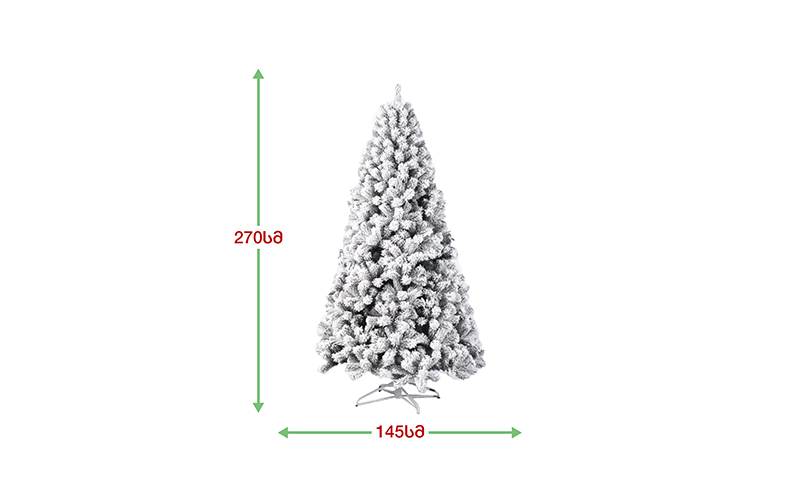 დათოვლილი ნაძვის ხე, დრეკადი მეტალის ტოტებით და ჯანმრთელობისთვის უსაფრთხო მასალისგან დამზადებული PVC წიწვით . მეტალის მყარი სადგამით და მთავარი ღერძით.