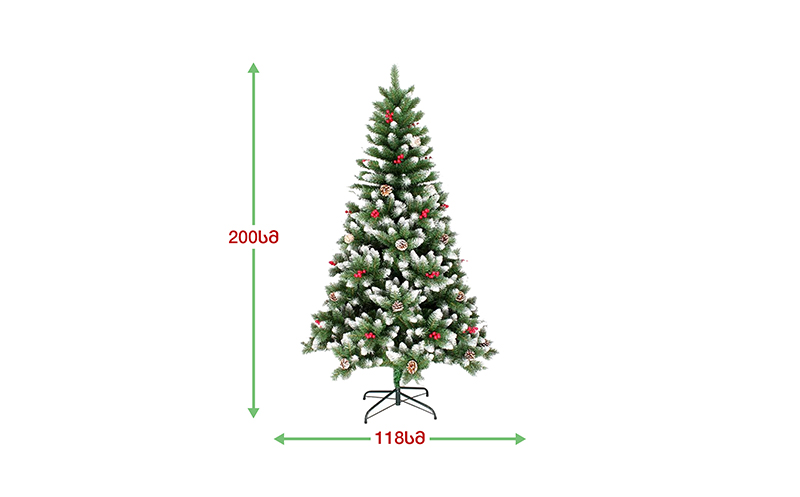 ნაძვის ხე დათოვლილი ბოლოებით, გაფორმებული გირჩებით და კენკრით. გამძლე დრეკადი მეტალის ტოტებით და ჯანმრთელობისთვის უსაფრთხო მასალისგან დამზადებული წიწვებით. მეტალის მყარი სადგამით და მთავარი ღერძით.