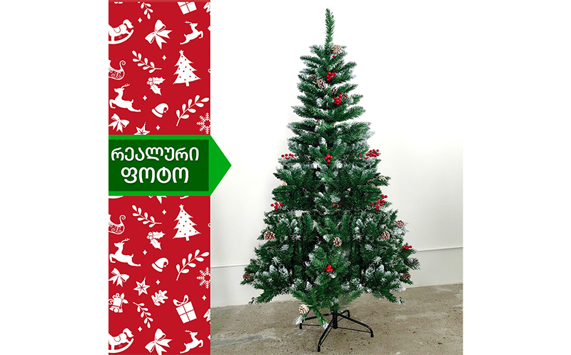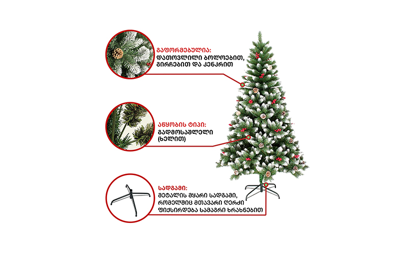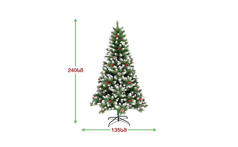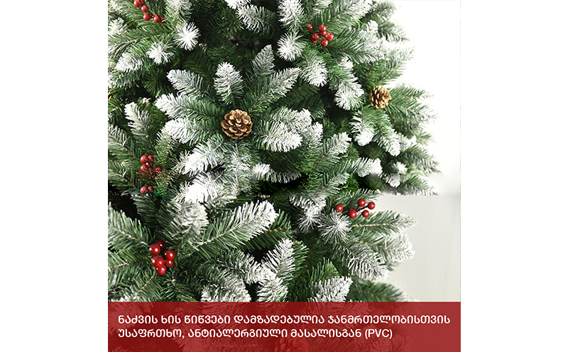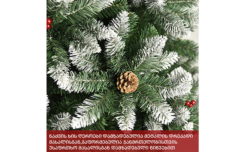 ნაძვის ხე დათოვლილი ბოლოებით, გაფორმებული გირჩებით და კენკრით. გამძლე დრეკადი მეტალის ტოტებით და ჯანმრთელობისთვის უსაფრთხო მასალისგან დამზადებული წიწვებით. მეტალის მყარი სადგამით და მთავარი ღერძით.