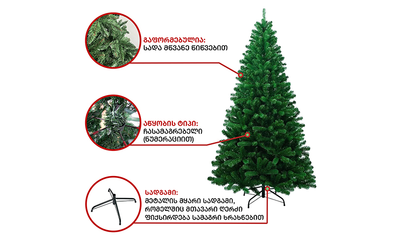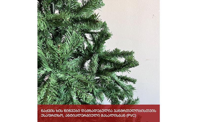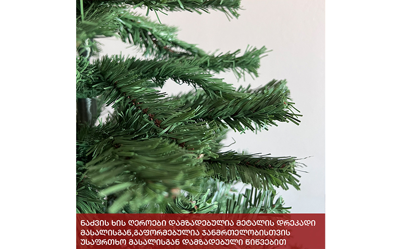 ნაძვის ხე გამძლე დრეკადი მეტალის ტოტებით და ჯანმრთელობისთვის უსაფრთხო მასალისგან დამზადებული წიწვებით. მეტალის მყარი სადგამით და მთავარი ღერძით.