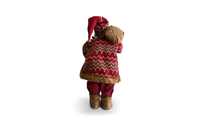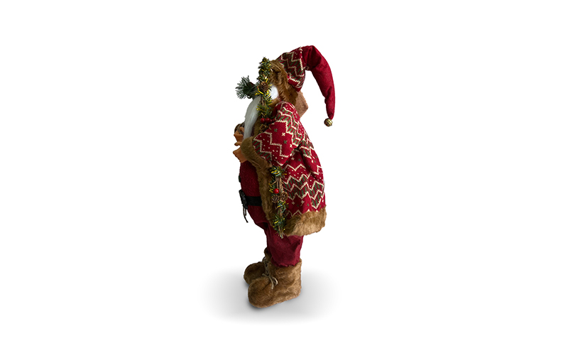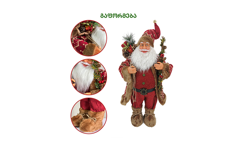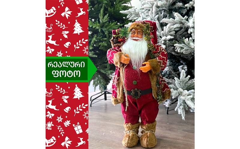 60სმ სიმაღლის სანტა კლაუსი, წითელ კოსტუმში. ყავისფერი ჩექმებით და პალტოთი. გაფორმებული დეკორაციებით: ზურგზე გადაკიდებული ხურჯინი და ხელში ჯადოსნური კვერთხი.